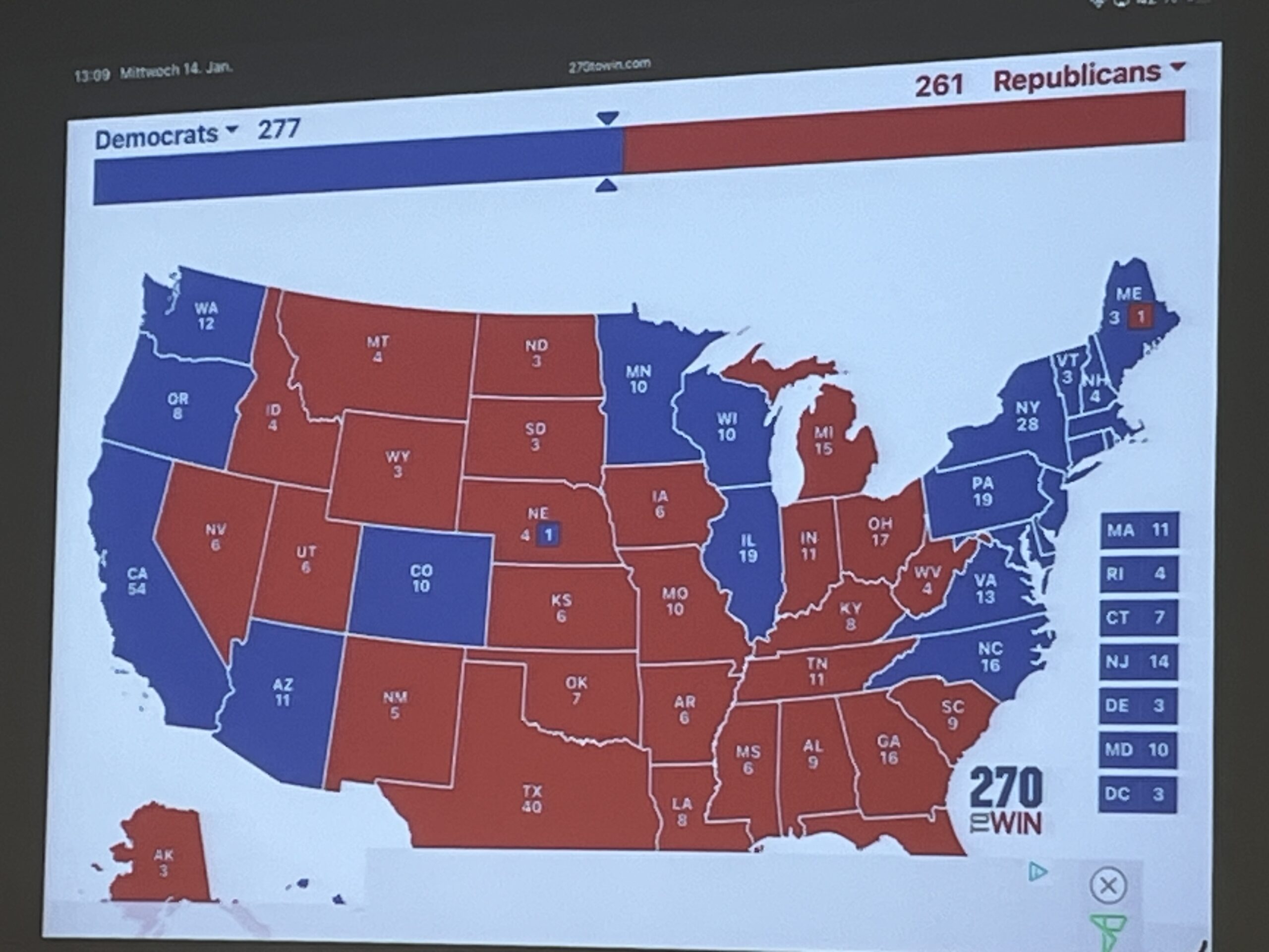Durchgeführt wurde diese Simulation von Frau Ackermann vom Amerikahaus in München. Simuliert wurde, wie der Titel schon verrät, das Rennen um die US-Präsidentschaft. Die Schülerinnen und Schüler schlüpften in die Rollen der Kandidatinnen und Kandidaten, ihrer Beratungsteams und von Wählerinnen und Wählern aus den so genannten Swing States, also der traditionell umkämpften US-Bundesstaaten wie etwa Georgia oder Michigan. Unter Anleitung von Frau Ackermann warben die Parteien um Stimmen, stellten sich den Fragen der Wählerschaft und fieberten dem Wahltag entgegen. In einem Kopf-an-Kopf-Rennen setzte sich in diesem Fall der Kandidat der Demokraten knapp durch.