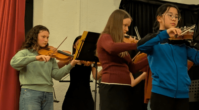 Schon im Februar 2026 trafen sich die Streicher der Schule. Von den Kleinsten der 5. Klasse bis zu den Abiturienten zeigten die gut geübten Ensembles ihr Können. Beginnend mit den Premieren-Gefühlen des Anfänger-Ensembles, das nach nur viereinhalb Monaten sauber und schwungvoll die Saiten zum Klingen brachte, war der prall gefüllte Saal der akustisch schönen Aula der Rückert-Schule sofort in Stimmung.