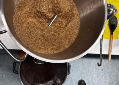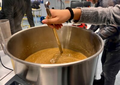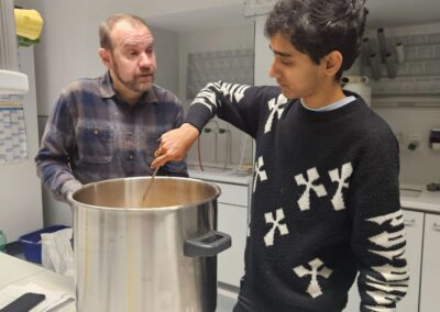 Im P-Seminar „Hopfen und Malz – ein Beitrag zum Erhalt der bayerischen (Brau-)Kultur“ widmeten sich die Schülerinnen und Schüler dem Brauhandwerk aus wissenschaftlicher Perspektive. Unterstützt von David Achatz (Braumeister der Hofbräu Oberle in Kosbach) wurde der gesamte Brauprozess – vom Maischen über das Läutern bis zur Gärung – praktisch erlebt und chemisch wie biologisch beleuchtet. So wurde deutlich, wie eng biochemische Prozesse und handwerkliche Präzision im Brauen miteinander verbunden sind.