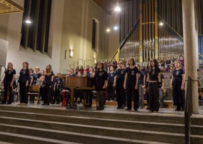 Zu den Blasorchesterklängen setzte der Große Chor (Leitung: Philipp Barth/Julian Bobe) mit der sicher vorgetragenen a capella-Motette „I Will Praise Thee, O Lord“ des vorwiegend als Chorkomponisten bekannten Norwegers Knut Nystedt einen passenden Kontrapunkt. Introvertiert eröffnete der Chor ebenfalls den Spiritual „Hear My Prayer“ von Moses Hogan, der mit glockenartigen Absprachen das Kirchenschiff zum Klingen brachte.